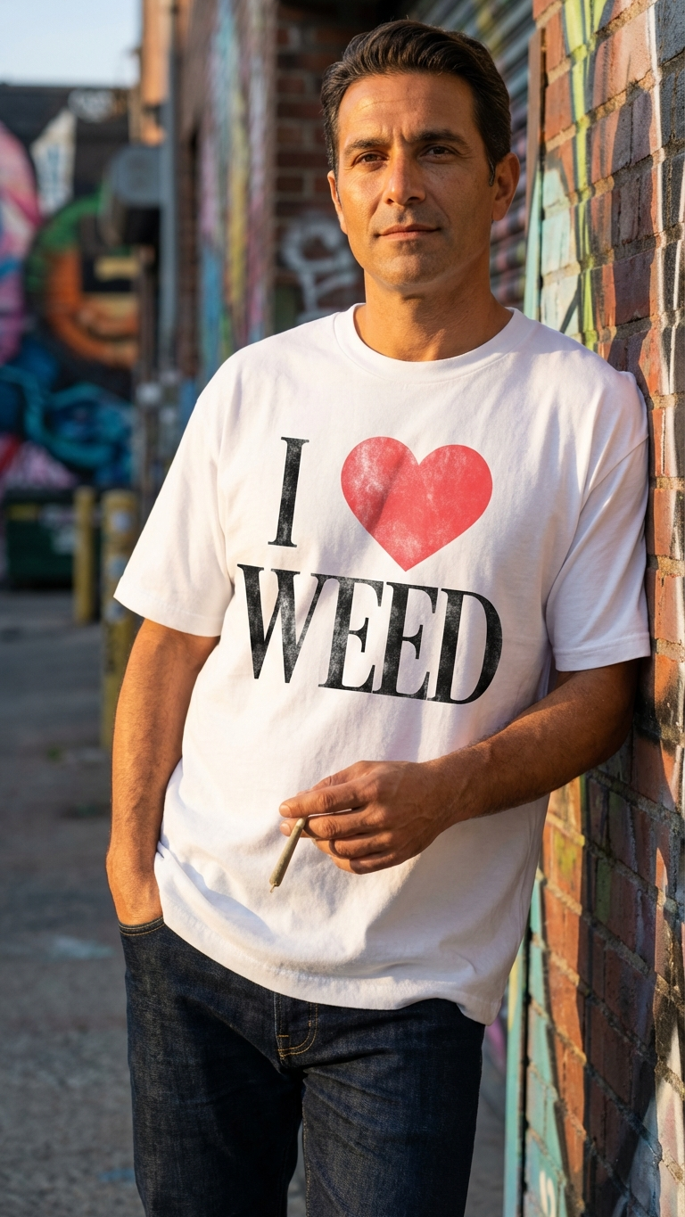 Soft, lived-in tee with a bold, playful statement. This garment-dyed, drop-shoulder shirt brings a relaxed silhouette and vintage-washed texture to everyday wear. The graphic — a watercolor heart above distressed serif lettering reading “I ♥ WEED” — feels casual and sincere, the kind of piece you reach for when you want to nod to your lifestyle without shouting. Lightweight but substantial, the fabric softens with every wash and the forward-thrusted shoulder seam keeps the neckline comfortable. Wear it to laid-back gatherings, weekend runs to the market, or quiet evenings on the porch. It reads like a short, personal note: easy, honest, and a little cheeky.